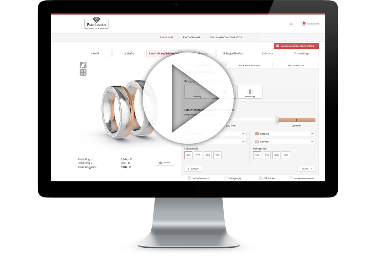 In unserem 3D Konfigurator kreieren wir gemeinsam mit Euch Euren Wunschring, egal, ob Trauring, Partnerring oder Freundschaftsring. Vereinbart dazu einfach einen Termin in unserem Trauring Shop in Paderborn. Wir beraten Euch individuell und zeigen Euch im Konfigurator direkt, wie Eure Trau(m)ringe Realität werden!